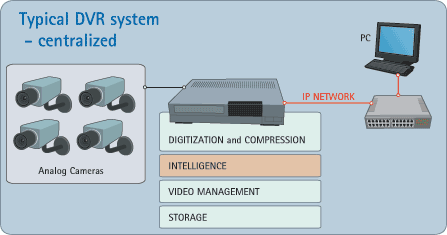 DVRs e inteligência centralizadaPara permitir o monitoramento central dos tradicionais sistemas de CFTV, a vigilância por vídeo pode ser alimentada diretamente das câmeras analógicas para um DVR ativado por vídeo inteligente. O DVR executará a análise do vídeo (contagem de pessoas ou extração de placa de veículo, por exemplo) antes de coletar os dados restantes, digitalizando, compactando e gravando-os; em seguida, distribuirá os alarmes resultantes e a saída de vídeo entre os operadores autorizados. Nessa arquitetura, cada câmera analógica é conectada por um cabo coaxial ao DVR. Embora essa abordagem funcione perfeitamente em instalações de pequeno porte, com número limitado de câmeras, não é escalonável nem flexível. Cada DVR vem com um número específico de entradas. A adição de até mesmo uma câmera requer a adição de outro DVR, o que tem um custo. Além disso, como os DVRs são dispositivos incorporados proprietários, não podem ser facilmente colocados em rede, nem usar aplicativos de vídeo inteligente de diferentes fornecedores. Também não dão suporte a utilitários gerais de rede, por exemplo, para segurança. |