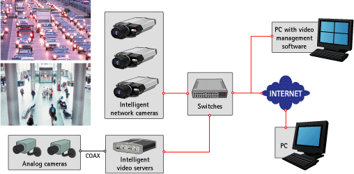Sistemas de vídeo em rede e inteligência distribuídaO vídeo em rede permite uma estratégia completamente diferente: a inteligência distribuída. Arquiteturas distribuídas são projetadas para superar os limites de arquiteturas centralizadas distribuindo o processamento por diferentes elementos na rede. A arquitetura mais escalonável, econômica e flexível é baseada na 'inteligência na periferia', ou seja, o maior processamento possível do vídeo nas câmeras de rede ou nos próprios codificadores de vídeo. Essa arquitetura requer menor quantidade de uso de largura de banda, pois as câmeras podem enviar dados e calcular de forma inteligente o vídeo que precisa ser enviado. Isso reduz de forma significativa o custo e a complexidade do modelo de processamento cêntrico de rede e elimina completamente os problemas de arquiteturas centralizadas. Se as câmeras tiverem, por exemplo, o recurso de detecção de movimento, em vez de transmitirem todos os vídeos, somente o vídeo que interessa, que inclui o movimento, pode ser enviado à estação de monitoramento para a devida ação e análise. A carga sobre a infra-estrutura e as pessoas envolvidas cai enormemente. Para uma análise especializada de vídeo, onde somente os dados são necessários e não o vídeo, por exemplo, contagem de pessoas ou reconhecimento automático de placa de veículo, a execução de aplicativos na câmera tem um enorme impacto, pois as câmeras podem extrair os dados necessários e enviar apenas essas informações, com, talvez, alguns instantâneos. |